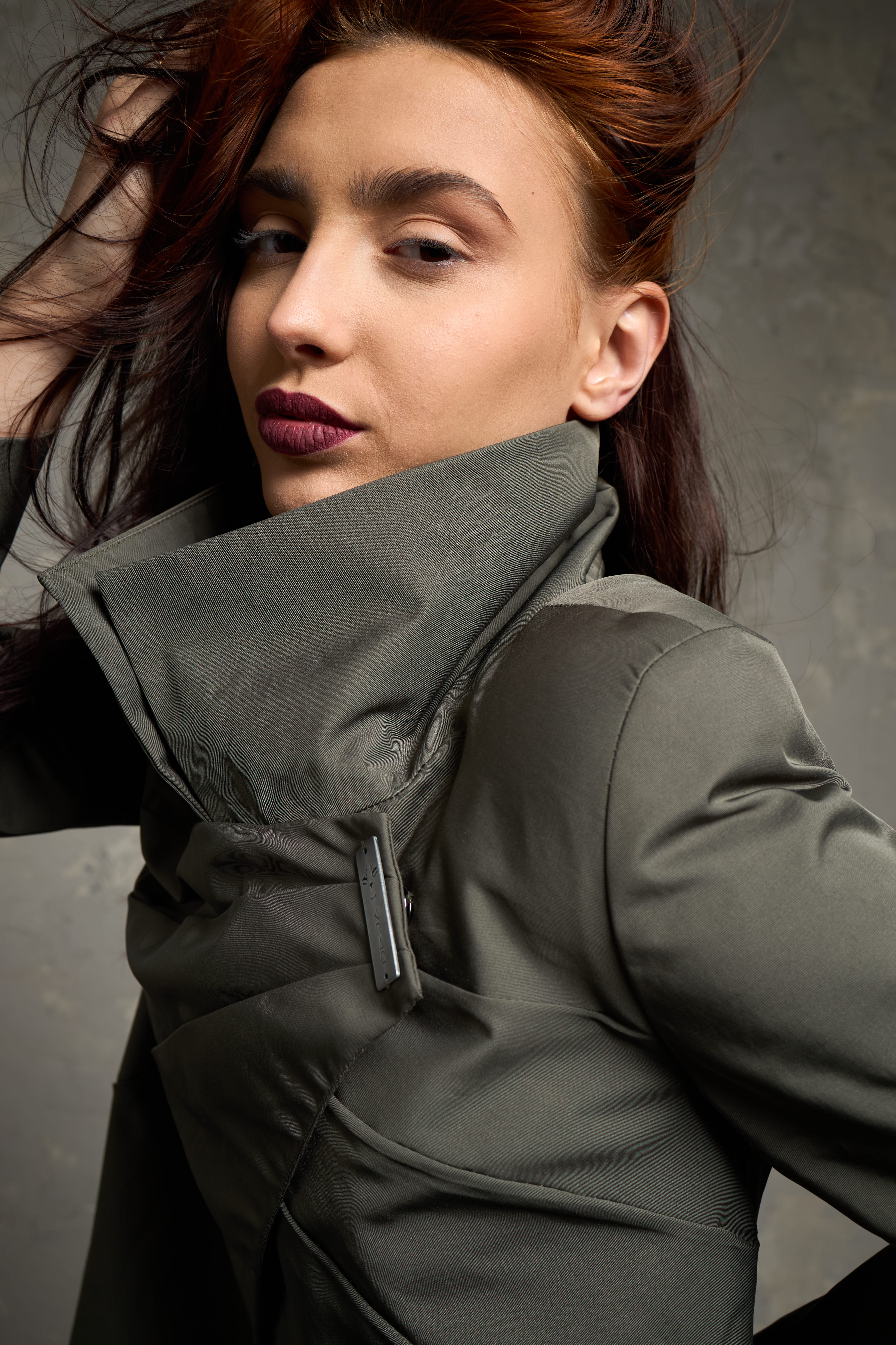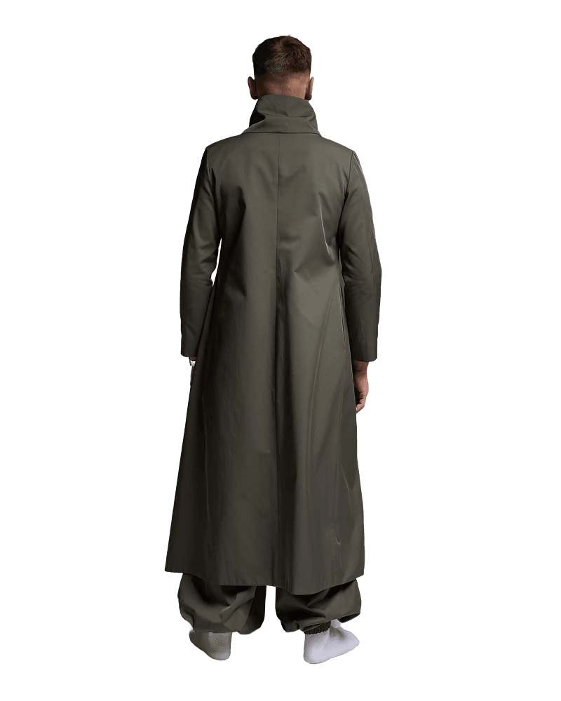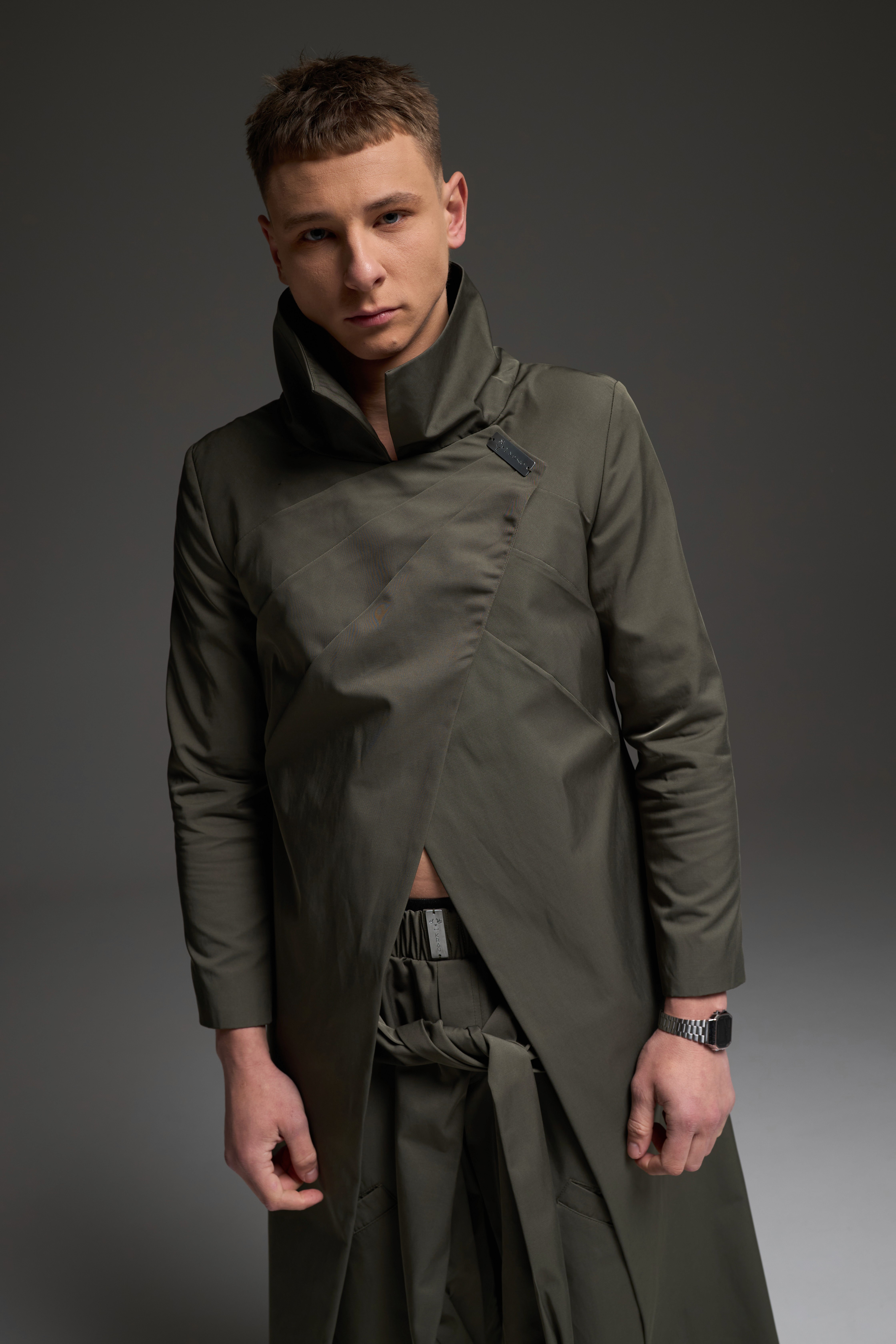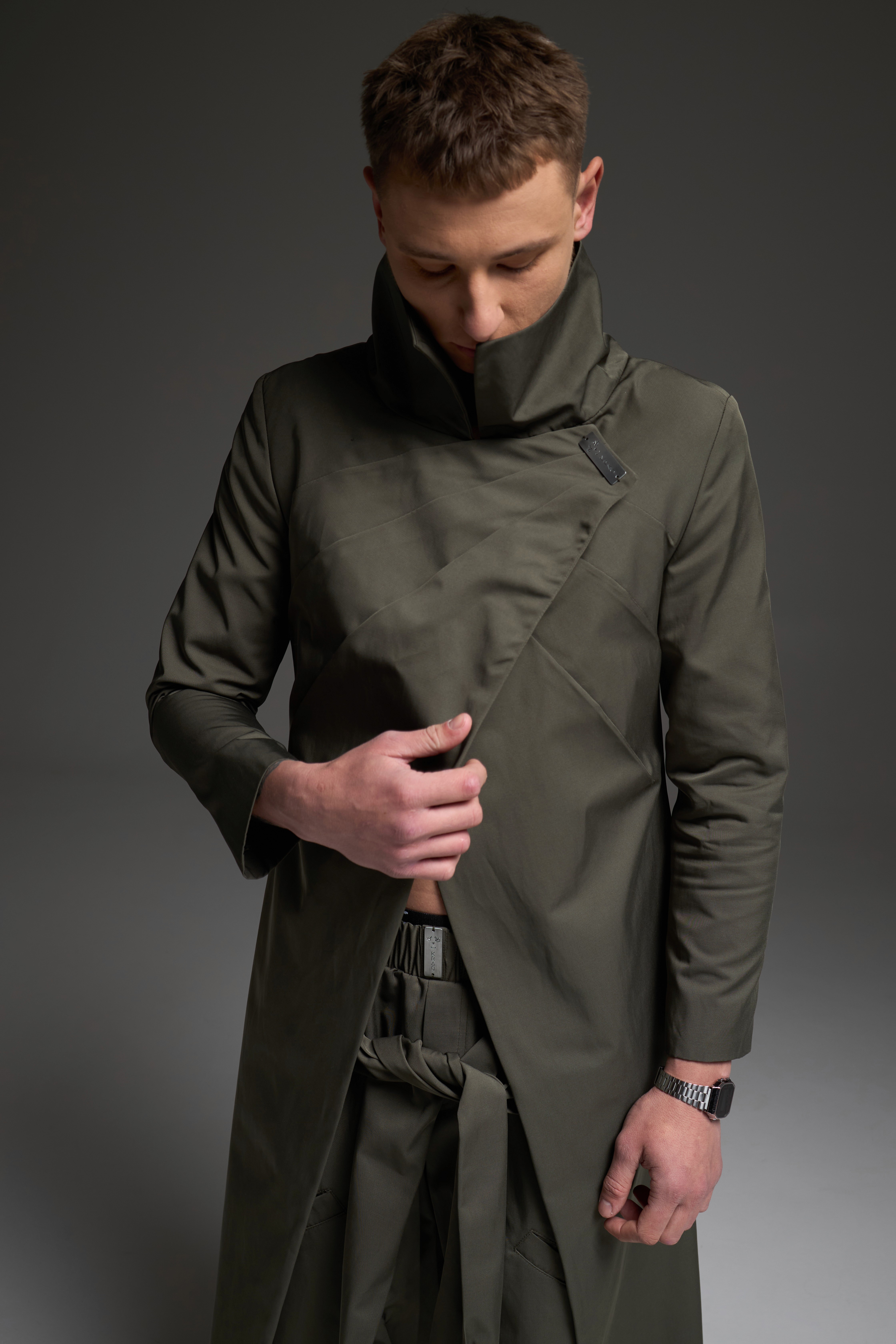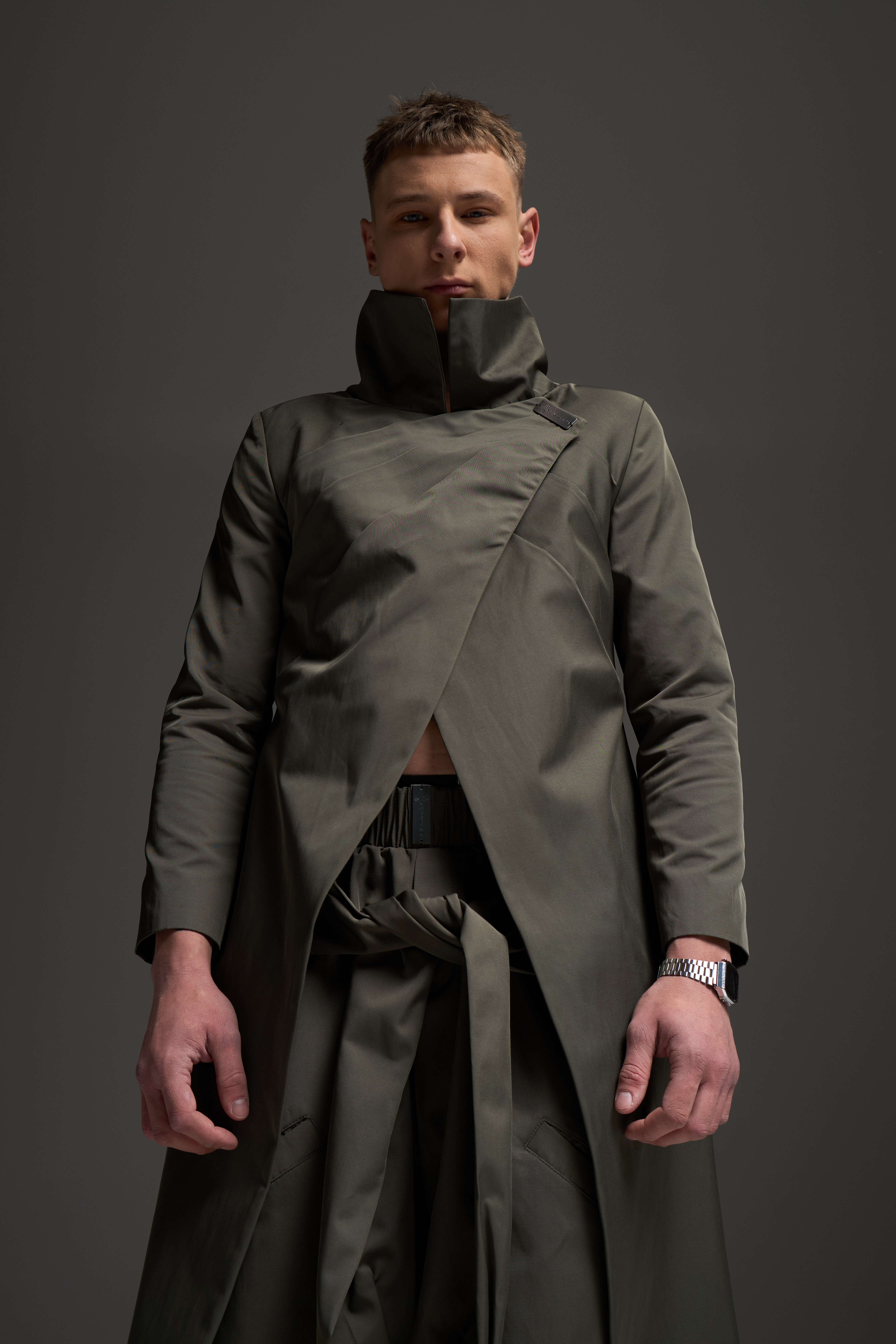 Architectural shell coat with a transformable high collar, water-repellent fabric and a clean silhouette that adapts from sharp to casual.