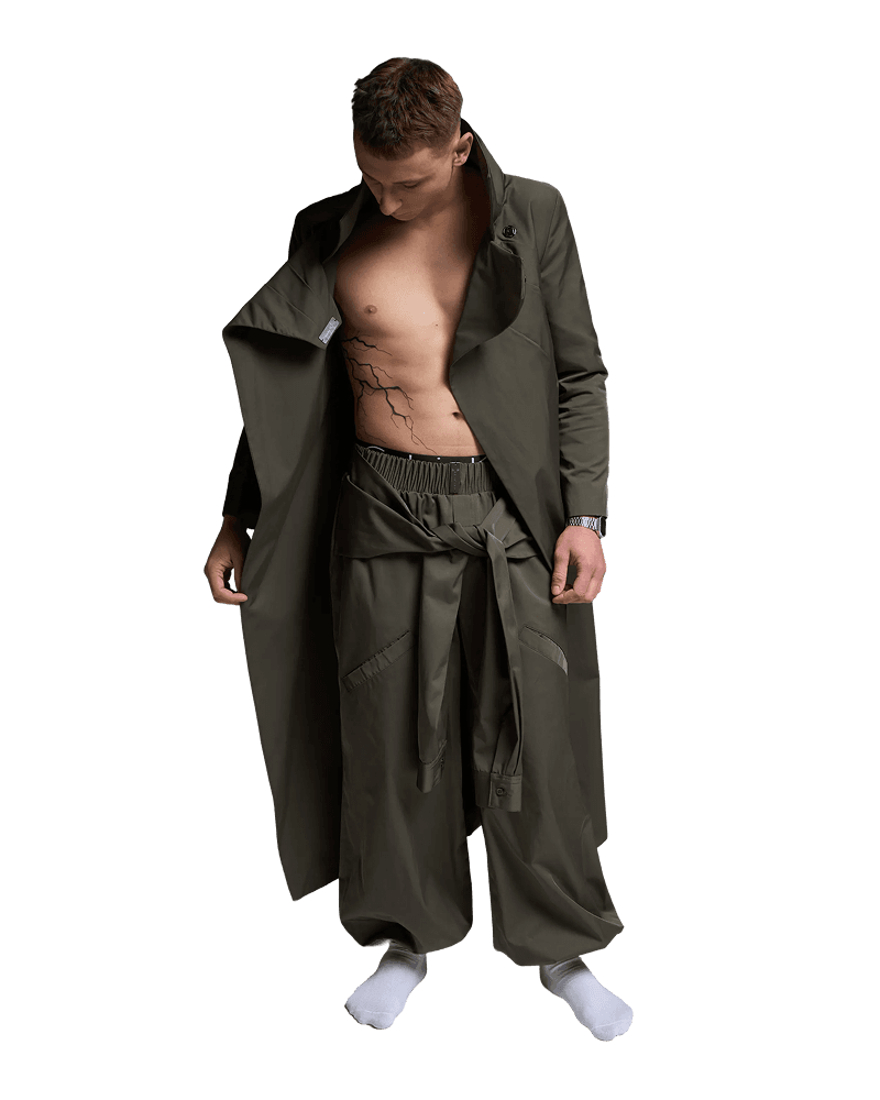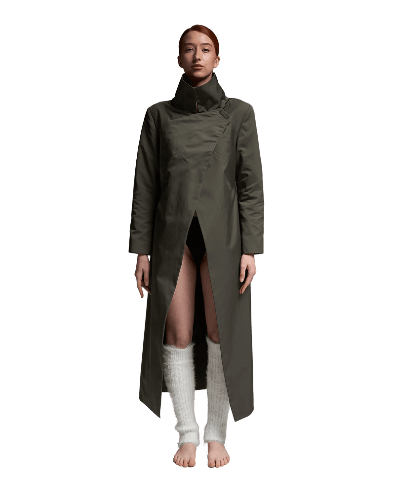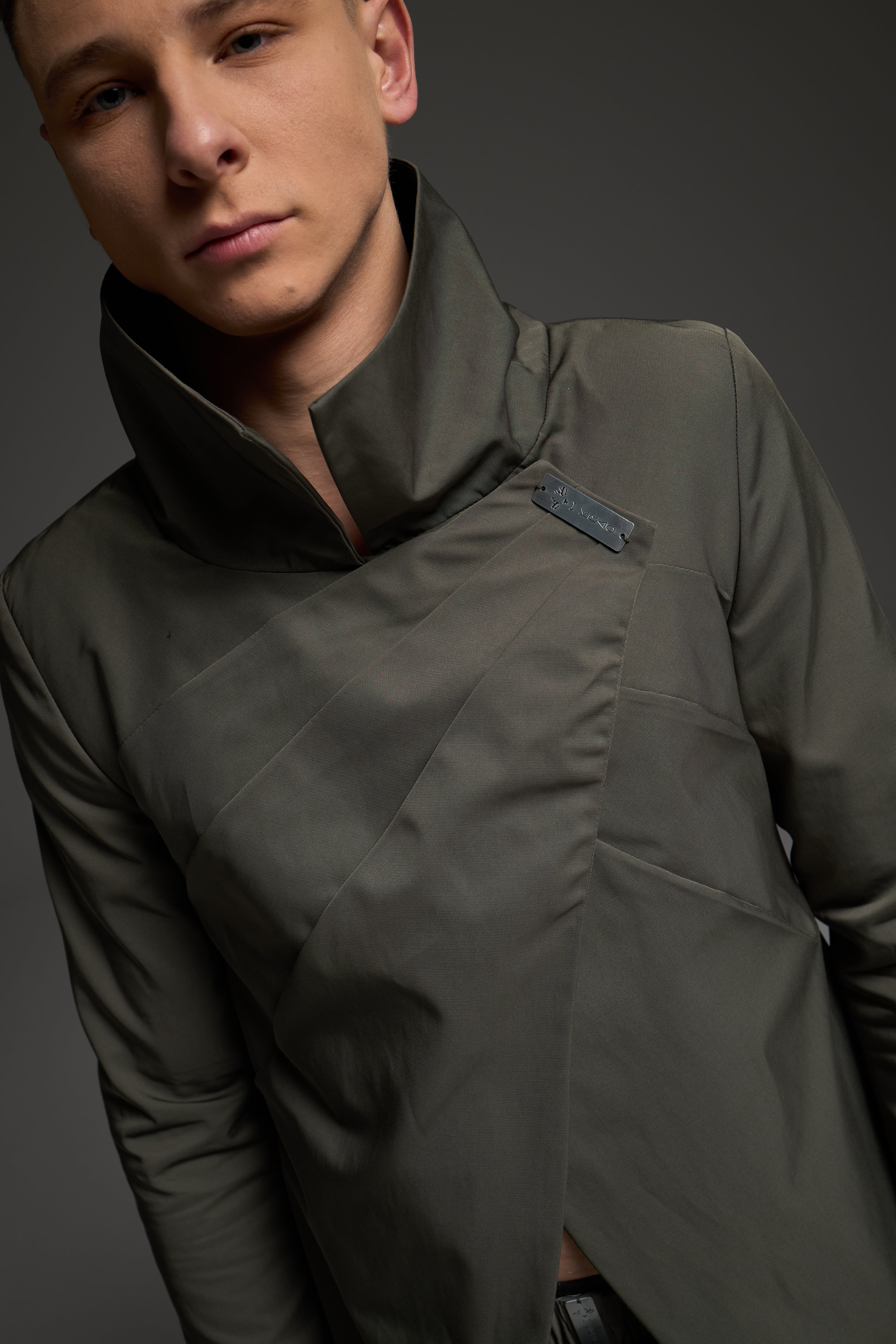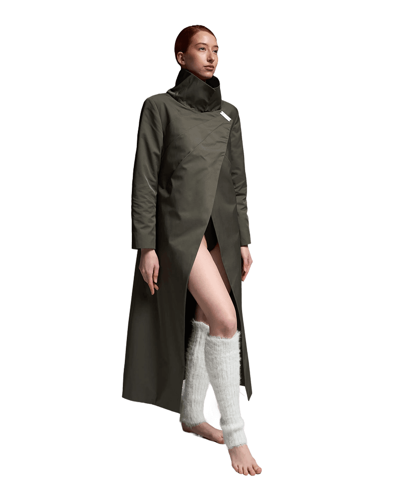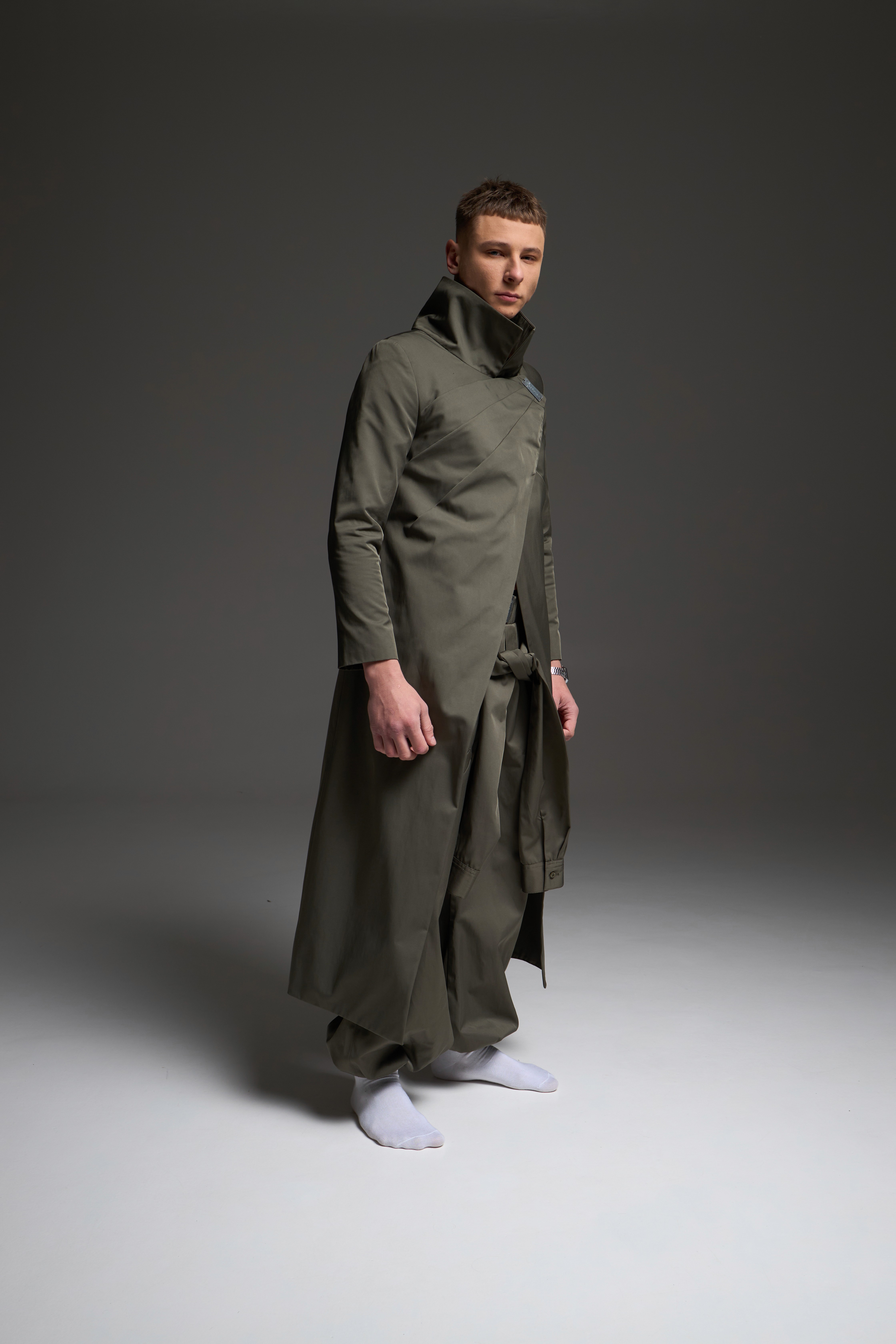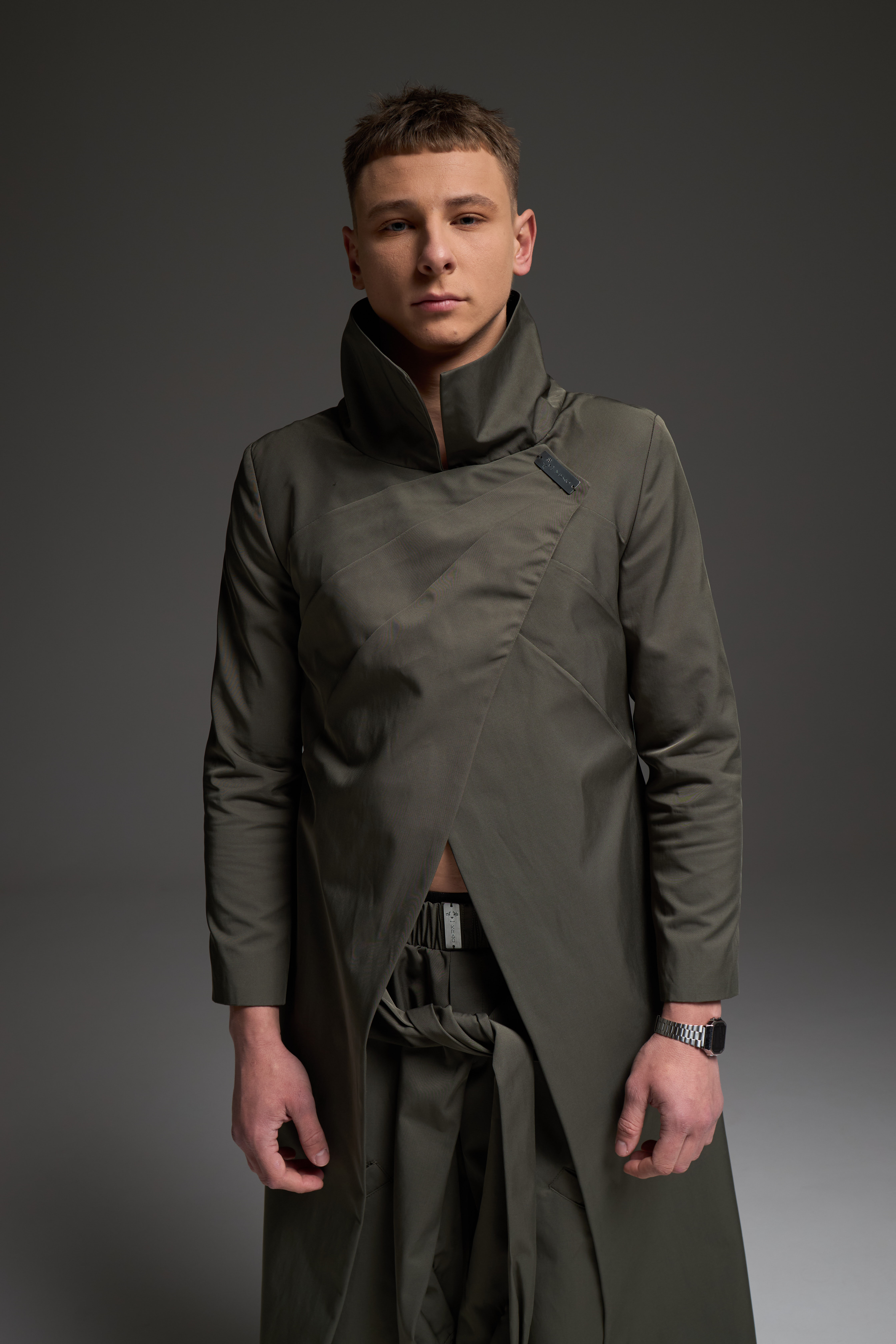 Architectural shell coat with a transformable high collar, water-repellent fabric and a clean silhouette that adapts from sharp to casual.