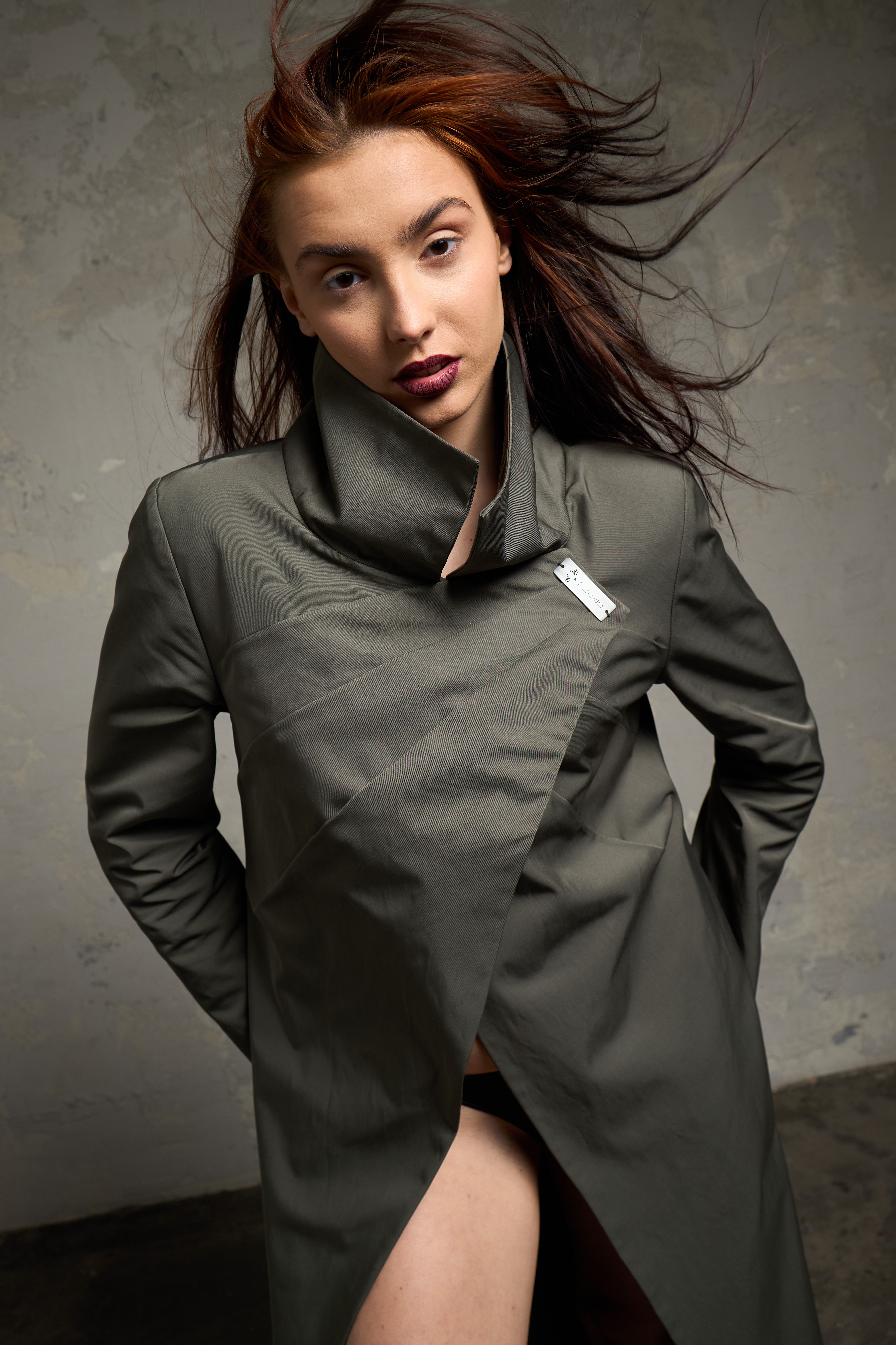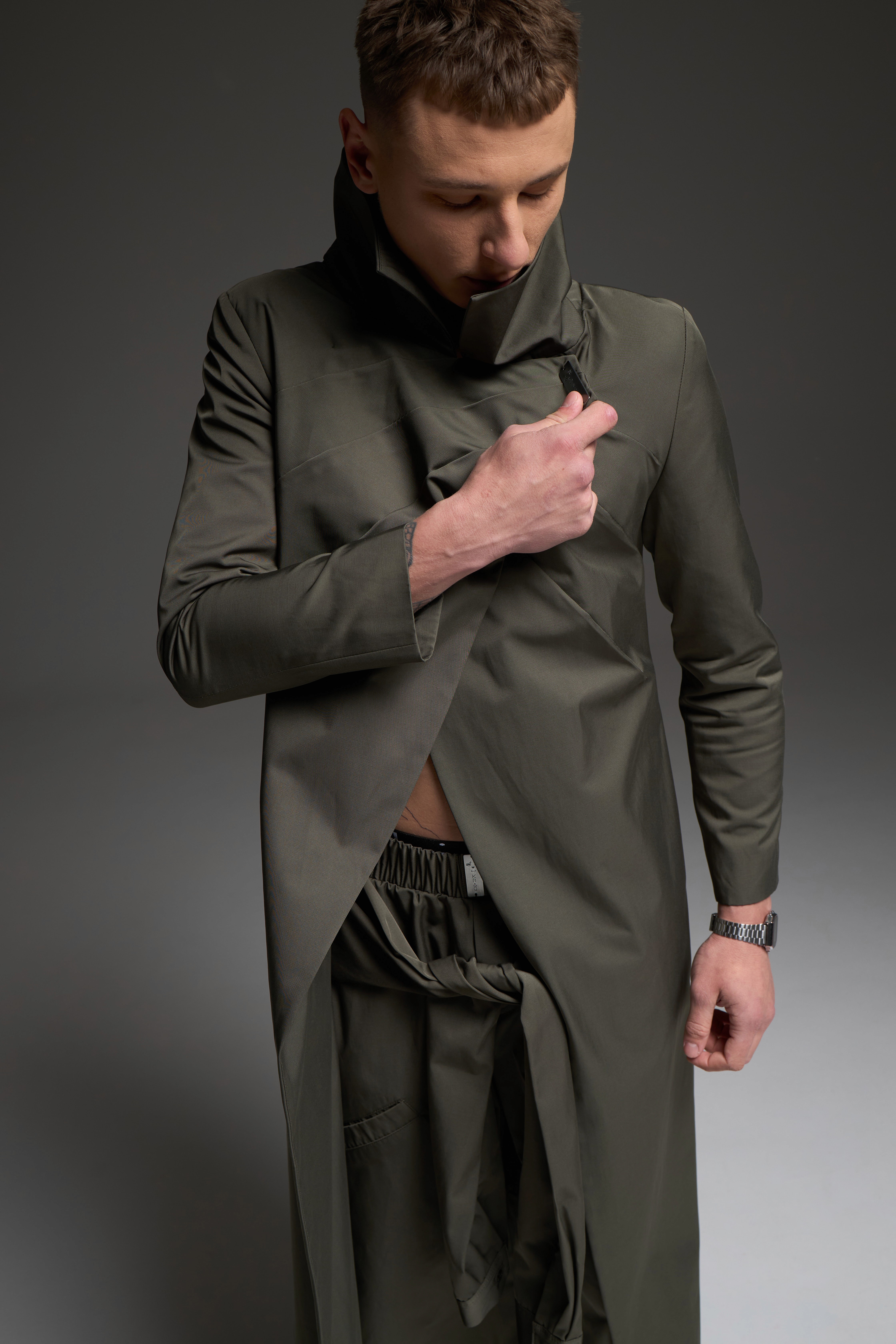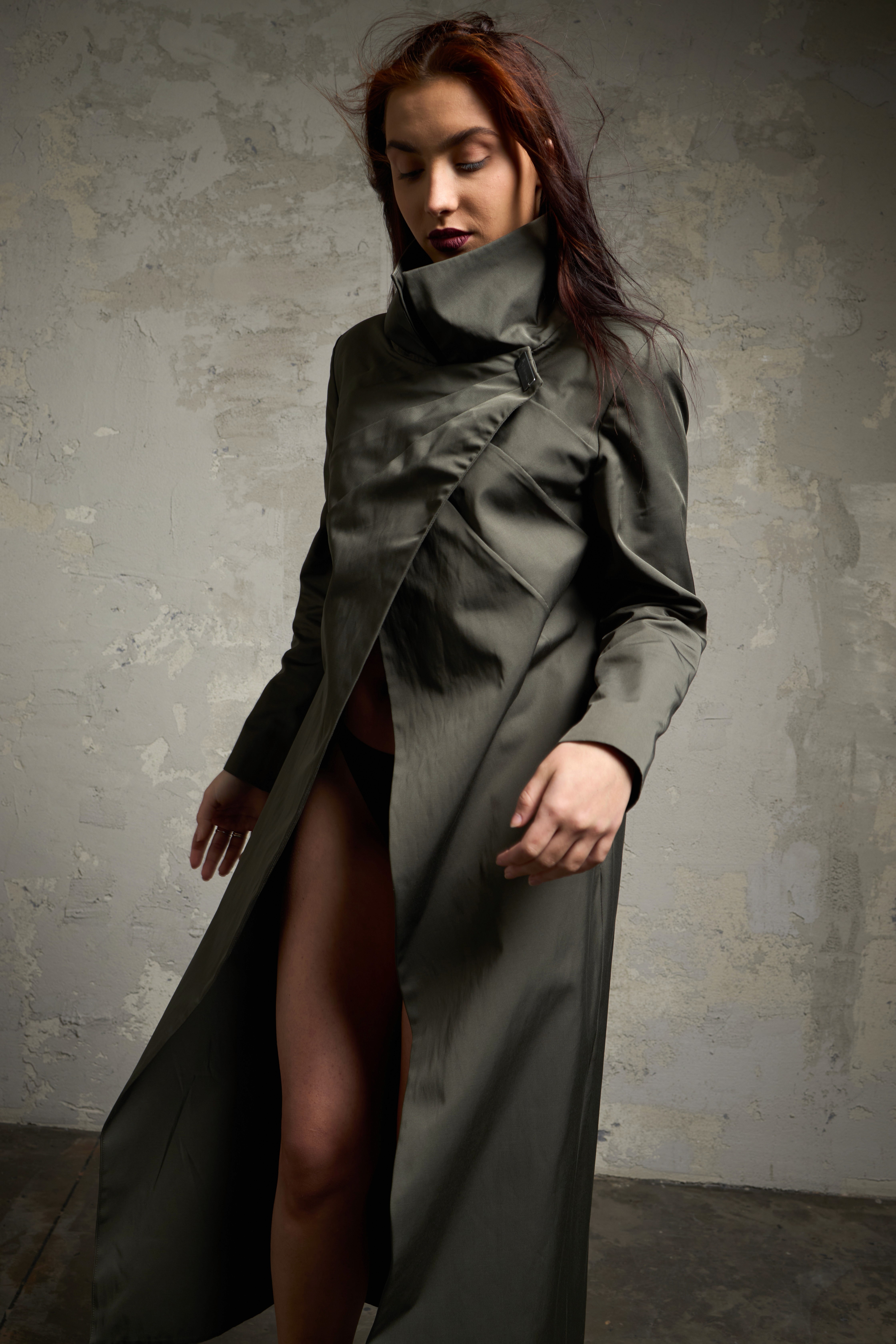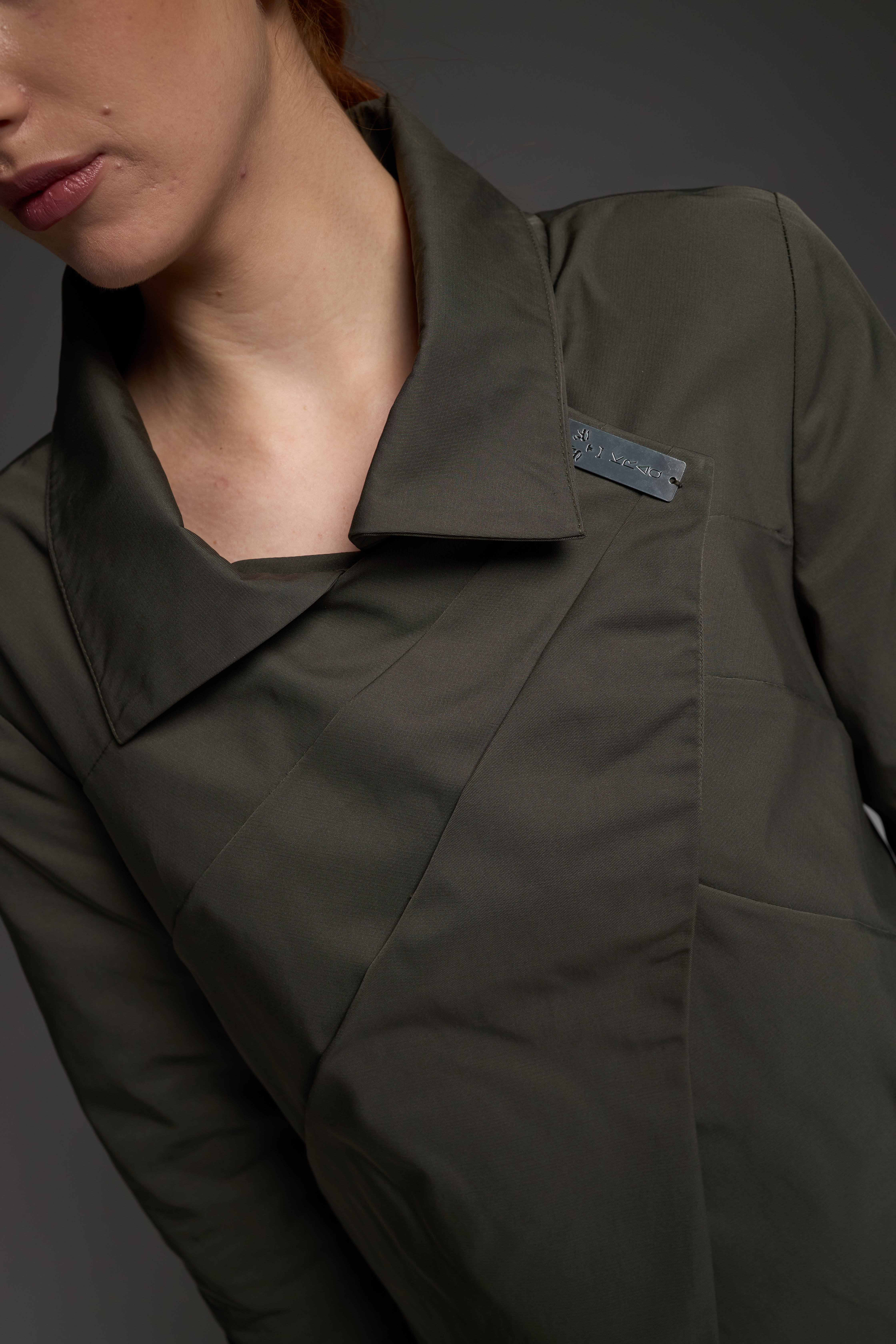 Architectural shell coat with a transformable high collar, water-repellent fabric and a clean silhouette that adapts from sharp to casual.