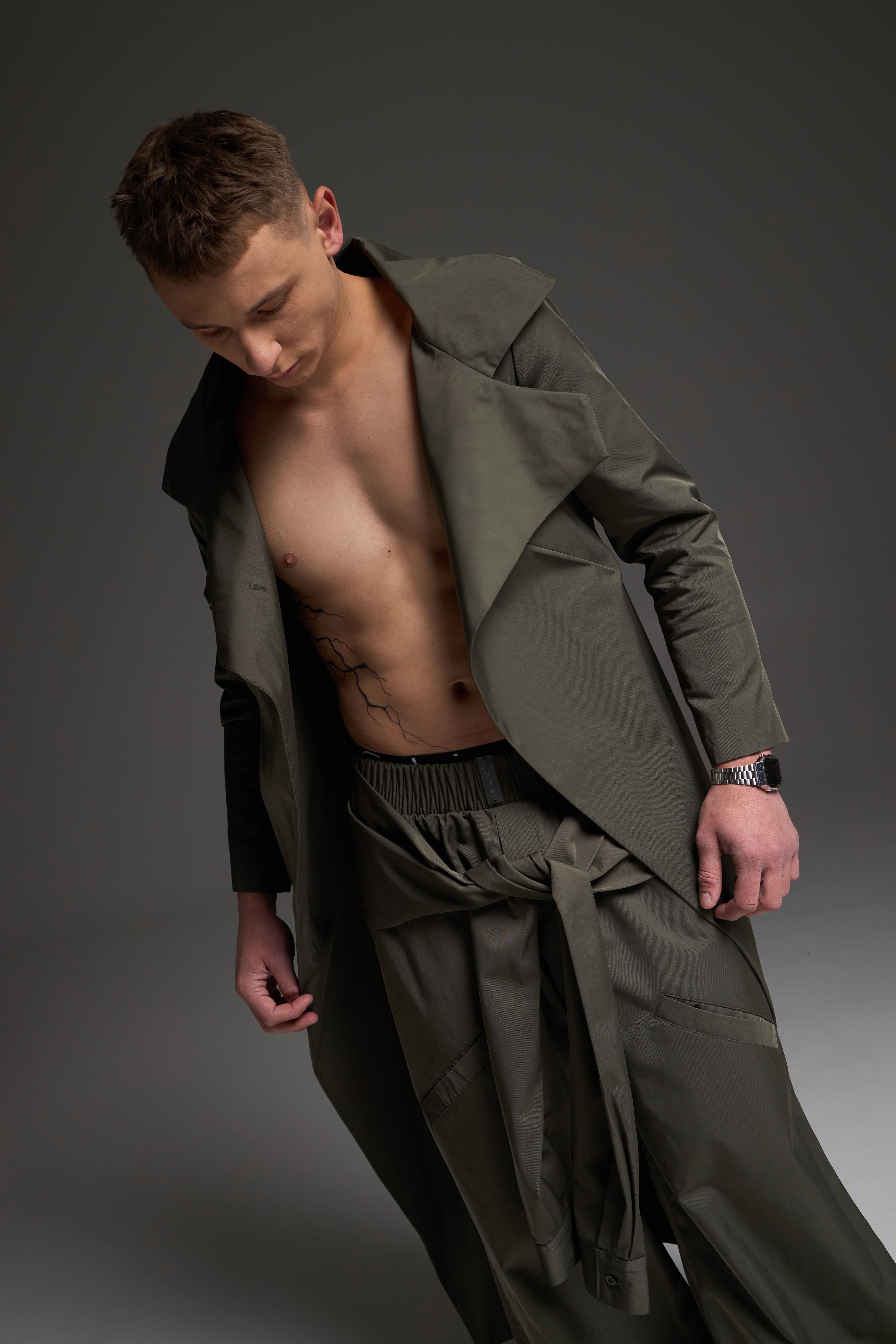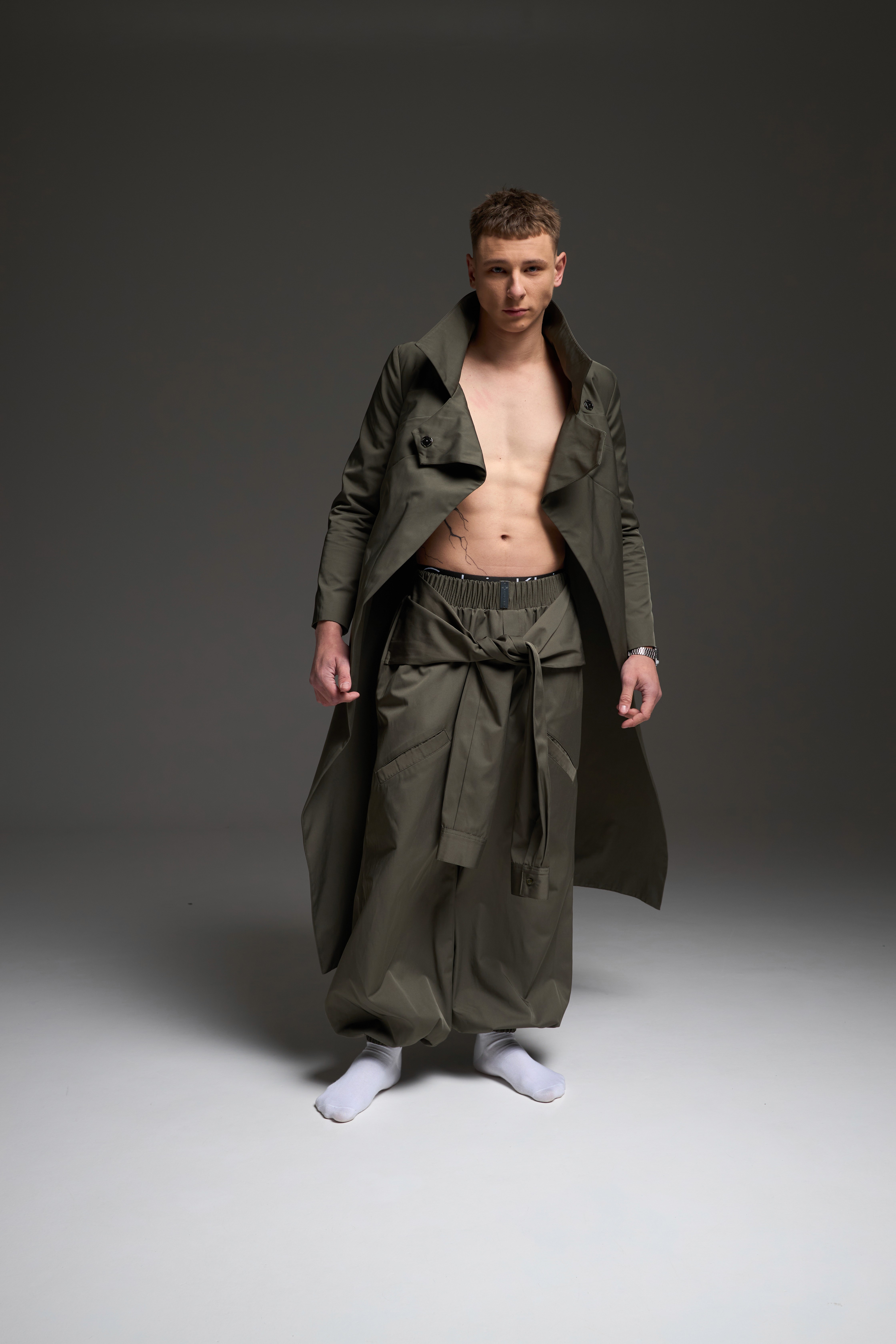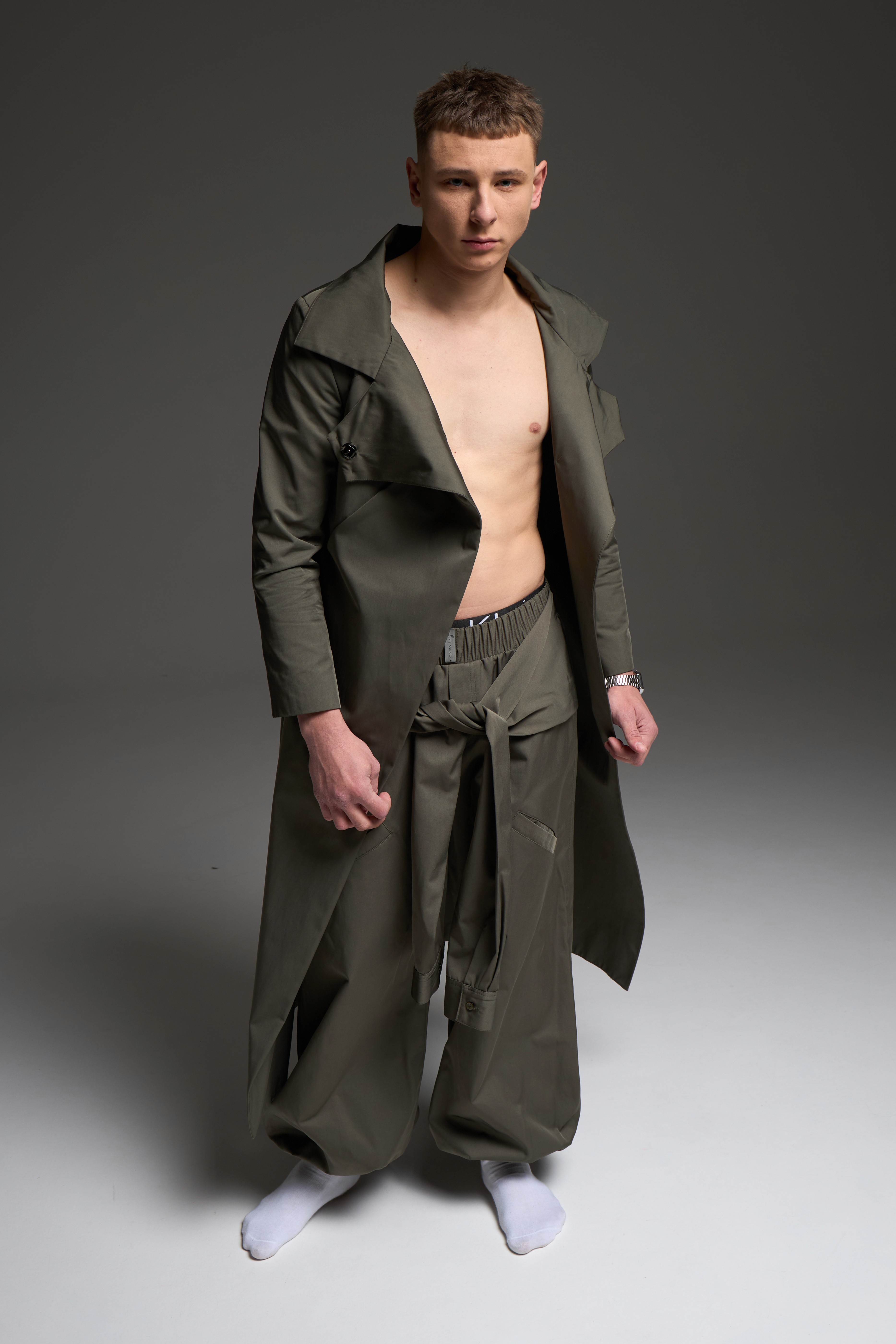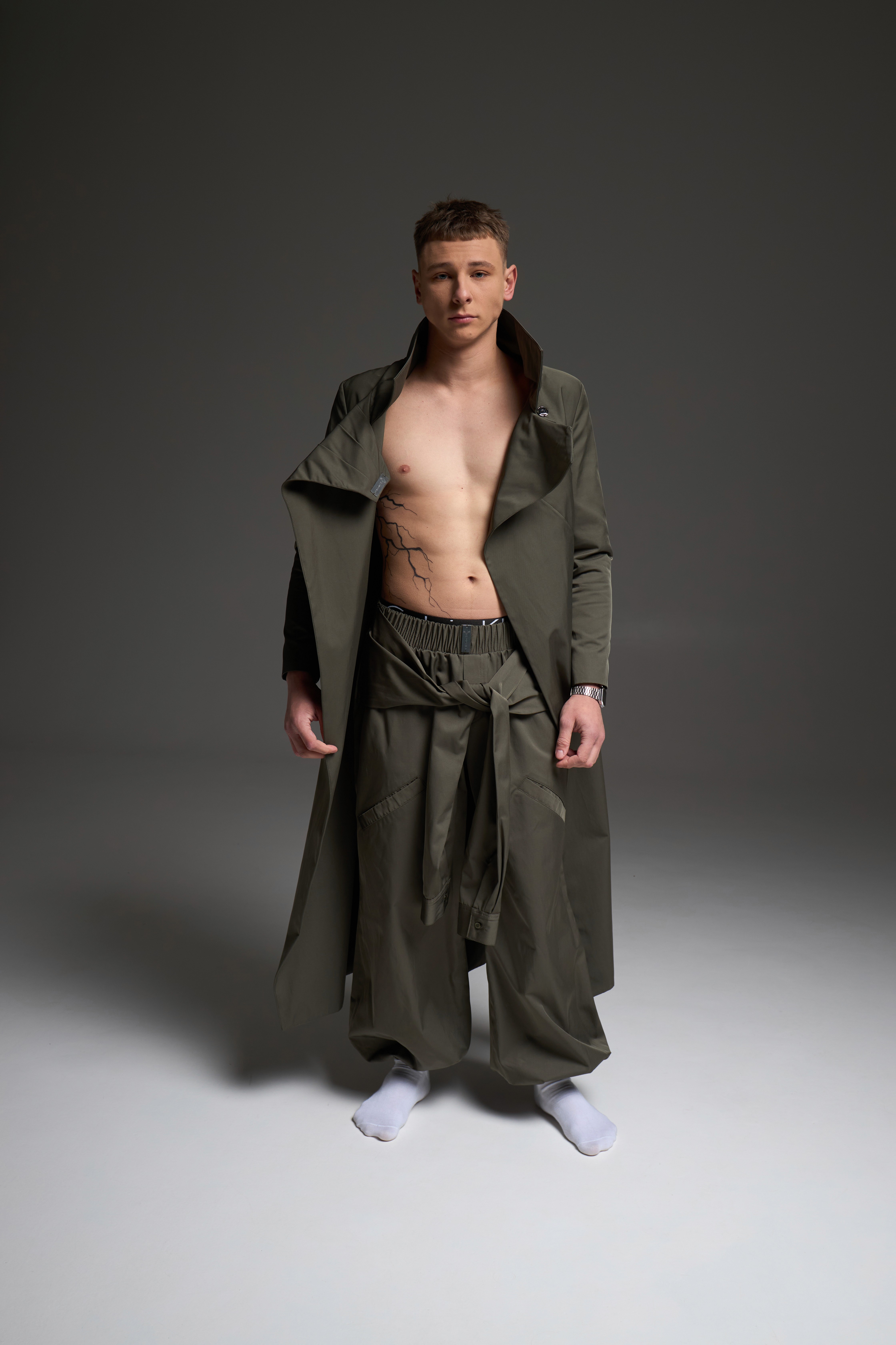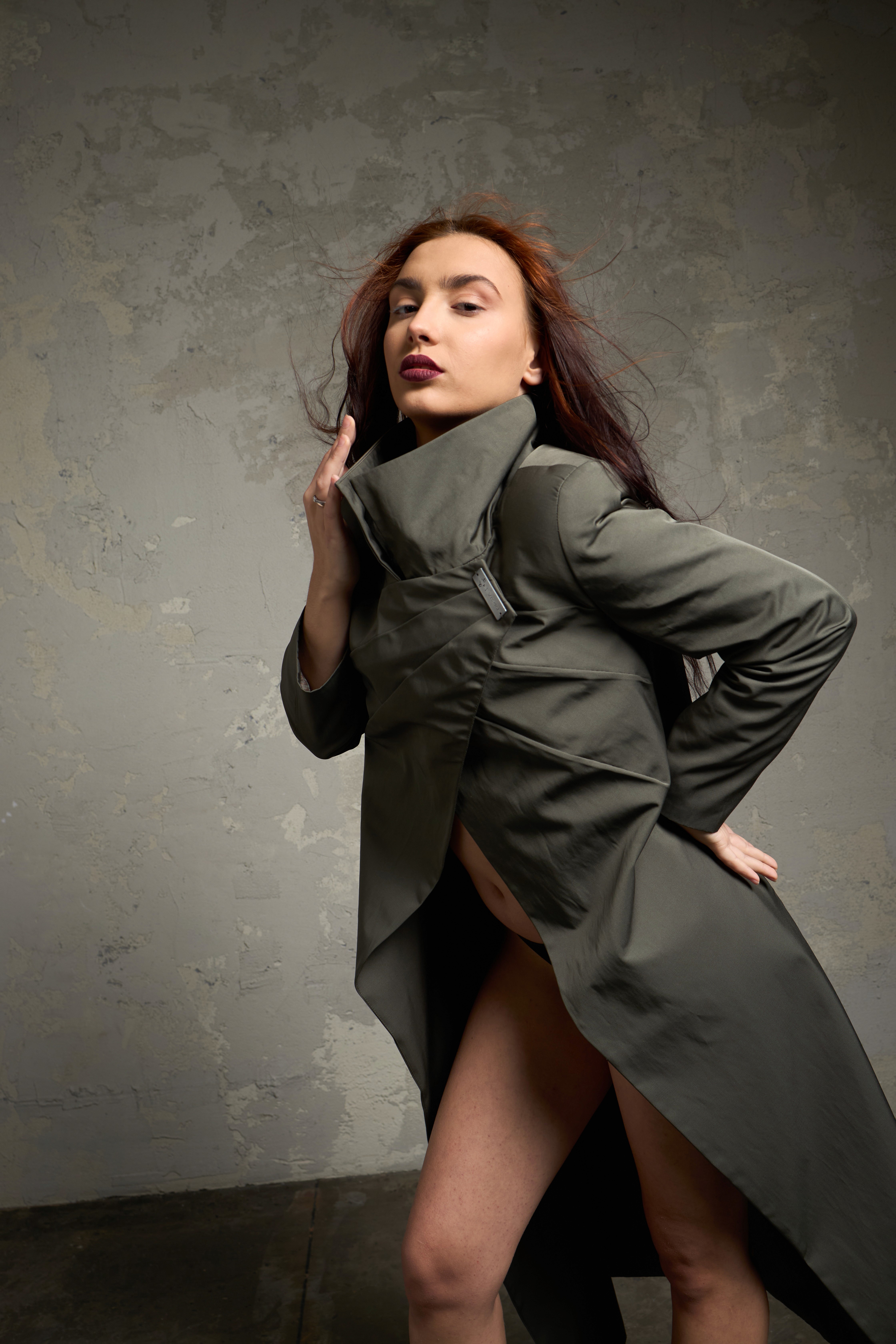 Architectural shell coat with a transformable high collar, water-repellent fabric and a clean silhouette that adapts from sharp to casual.