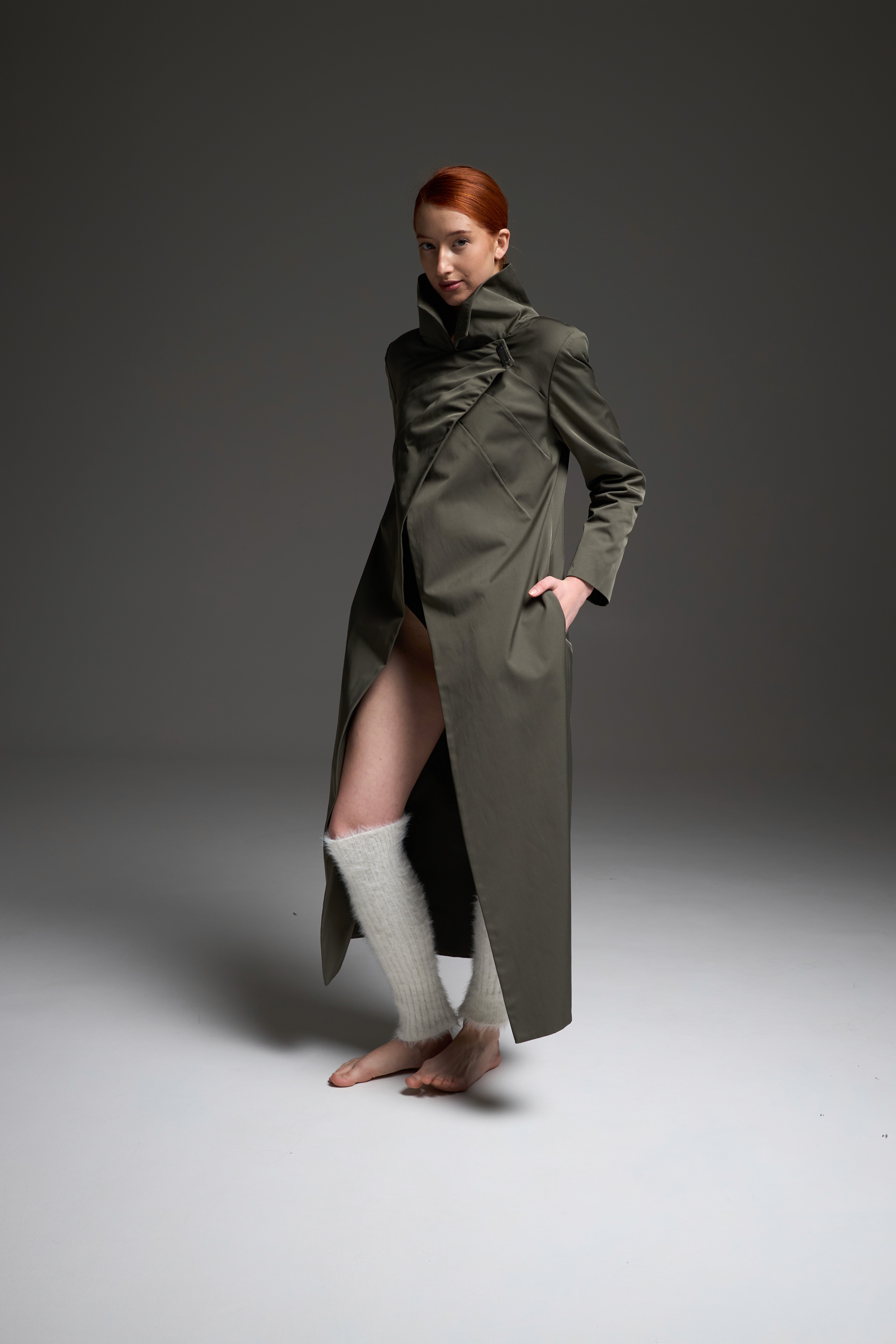 A defining feature is the high, transformable collar - it can be worn upright for a sharp, structured presence or reshaped for a softer, more relaxed silhouette. This flexibility allows the coat to shift mood and styling with ease.